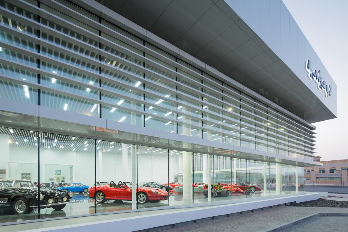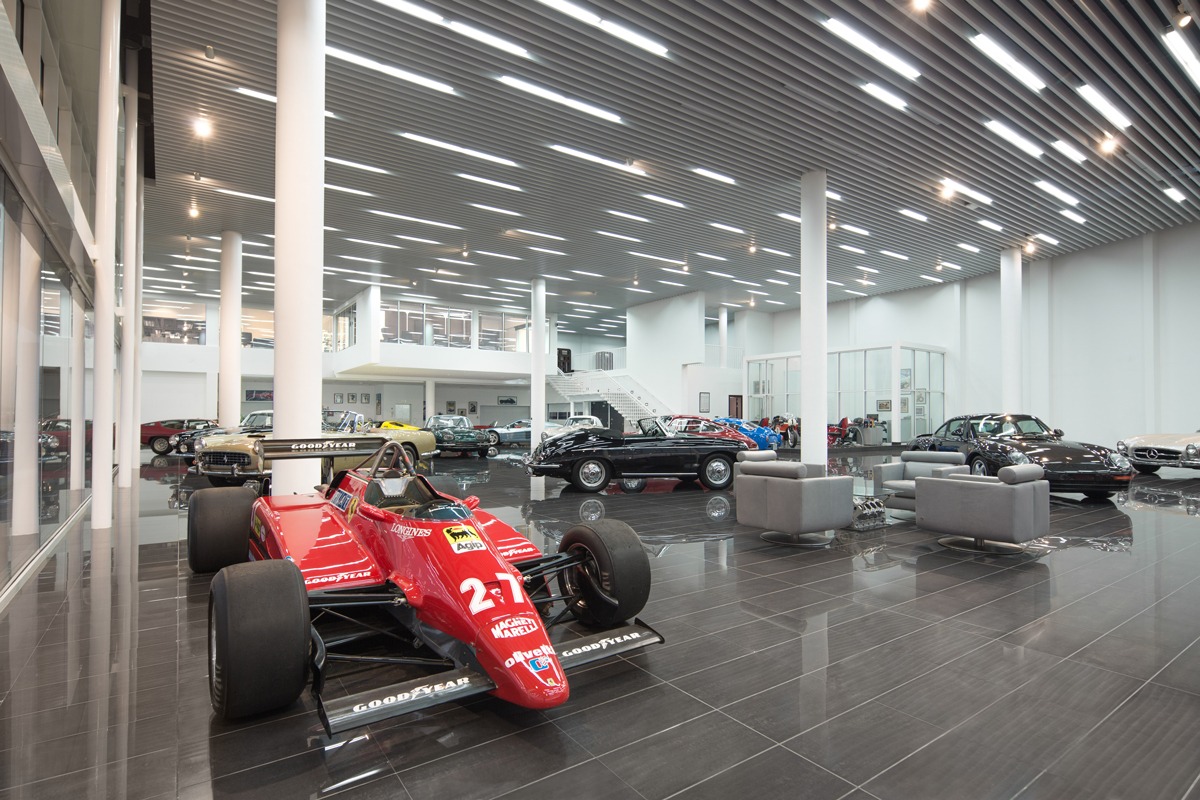 This clear distinctive design holds 100 cars of excellent pedigree and puts them on prominent display. The simplicity of the building’s lines allows the curves of the classic autos to be shown against a clear backdrop.